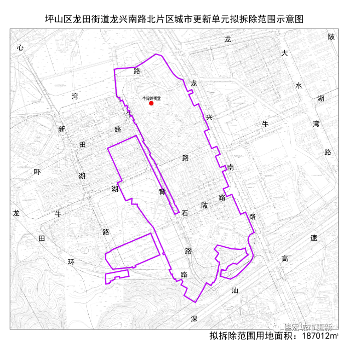 龍興南路北片區(qū)城市更新單元位于龍?zhí)锝值例執(zhí)锷鐓^(qū),深汕高速公路與龍興南路交匯處西北側(cè),擬拆除范圍用地面積約187012㎡,擬更新方向?yàn)?/span>居住等功能。