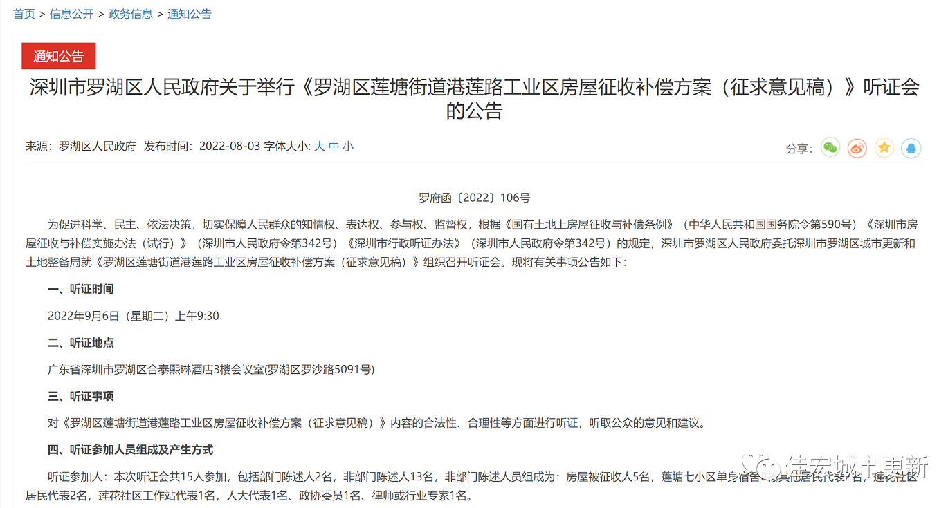【摘要】2022年8月3日,深圳市羅湖區(qū)人民政府發(fā)布關(guān)于舉行《羅湖區(qū)蓮塘街道港蓮路工業(yè)區(qū)房屋征收補償方案(征求意見稿)》聽證會的公告。
