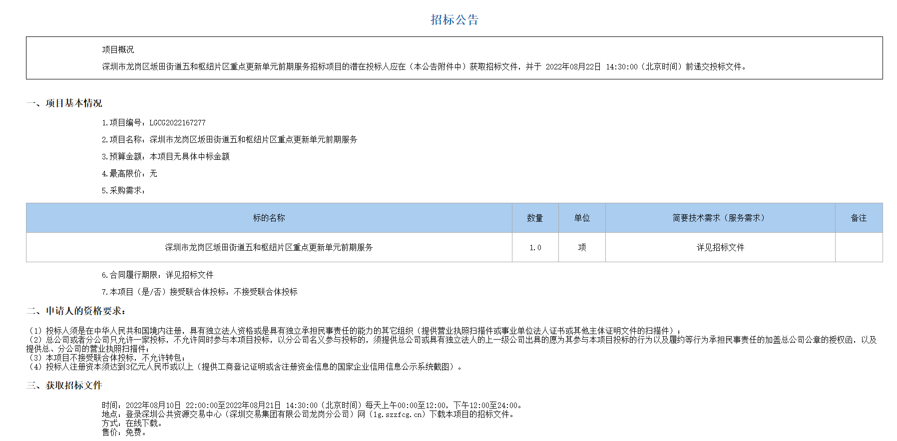 ◆ 2022年8月10日,深圳公共資源交易中心再次發(fā)布關(guān)于公開征求《深圳市龍崗區(qū)坂田街道五和樞紐片區(qū)重點更新單元前期服務(wù)》招標公告,投標截止時間:2022年08月22日 14:30:00(北京時間) 。