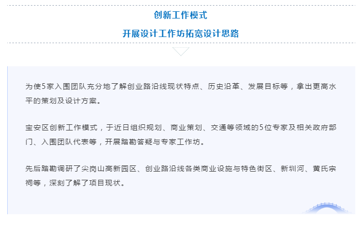 寶安區(qū)按照“寶安所能、灣區(qū)所向”的要求,搶抓機遇,主動謀劃,按照世界眼光、國際標準編制了國際咨詢任務書,通過國際咨詢向全球廣發(fā)“英雄帖”,征集寶安創(chuàng)業(yè)路商務大道策劃及城市設計方案。