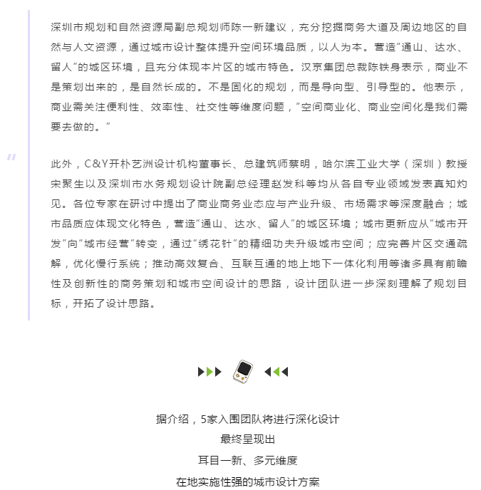 寶安創(chuàng)業(yè)路商務大道策劃及城市設計國際咨詢專家工作坊研討會順利召開,五家具有國際視野的知名設計團隊和行業(yè)頂尖專家齊聚寶安,共同謀劃“對話世界、國際一流、灣區(qū)標桿”的寶安“第五大道”。
