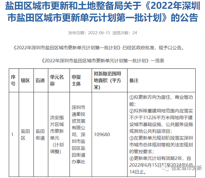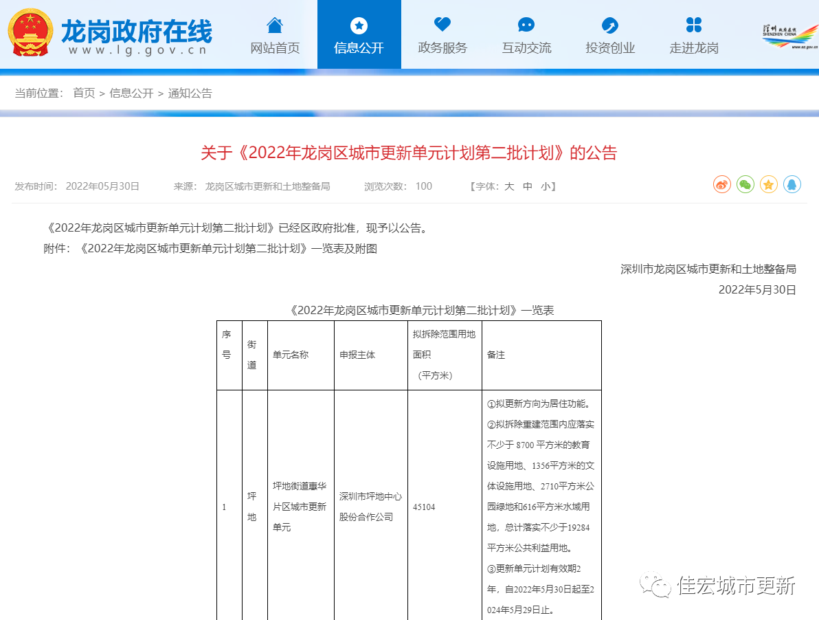 一、5月30日,龍崗區(qū)城市更新和土地整備局發(fā)布《2022年龍崗區(qū)城市更新單元計(jì)劃第二批計(jì)劃》的公告,本次公告僅公示一個(gè)項(xiàng)目,即坪地街道惠華片區(qū)城市更新單元,擬拆除范圍用地面積45104m²,擬更新方向?yàn)榫幼 ?