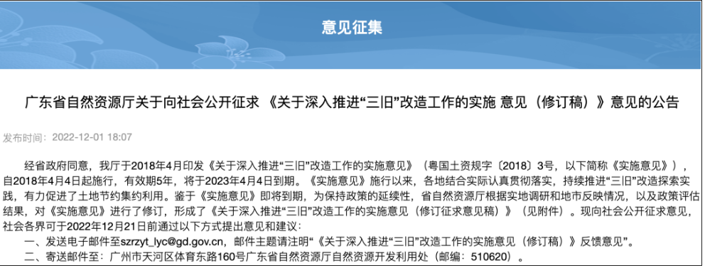 【摘要】近日,廣東省自然資源廳發(fā)布公告,就《關于深入推進“三舊”改造工作的實施意見(修訂稿)》(下簡稱《修訂稿》)面向社會公開征求意見。