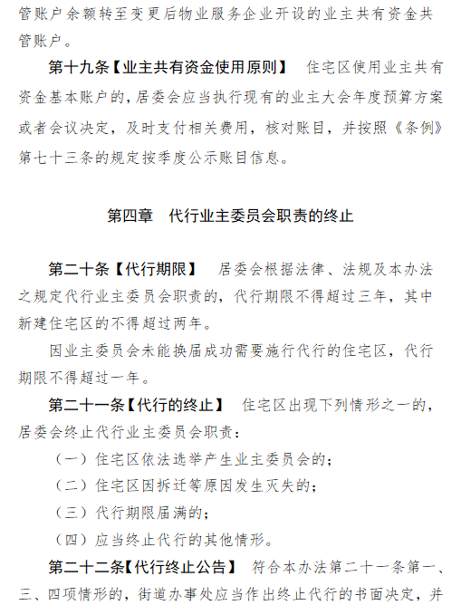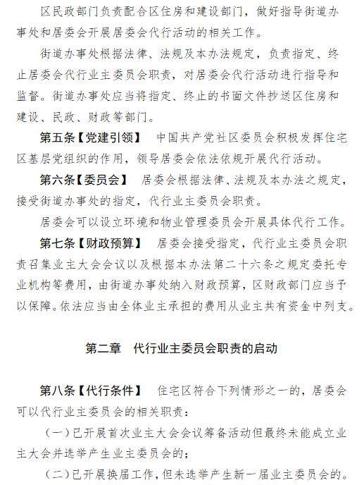 《管理辦法》第五章第二十五條至第三十條對(duì)代行的法律效力、委托專業(yè)服務(wù)、代行期限以及制定示范文本等事項(xiàng)予以了具體規(guī)范。其中第二十七條明確規(guī)定,在代行期間,住宅區(qū)業(yè)主向街道辦事處提請(qǐng)成立首次業(yè)主大會(huì)會(huì)議籌備組或者業(yè)主委員會(huì)換屆小組的,街道辦事處應(yīng)當(dāng)繼續(xù)履行組織成立業(yè)主大會(huì)和選舉業(yè)主委員會(huì)的相關(guān)職責(zé),街道辦事處不得以住宅區(qū)已實(shí)行社區(qū)居民委員會(huì)代行為理由拒絕履行或拖延履行法定義務(wù),體現(xiàn)社區(qū)居民委員會(huì)代行是補(bǔ)充機(jī)制,而非常規(guī)機(jī)制,再次強(qiáng)化了“非必要不代行”的原則。