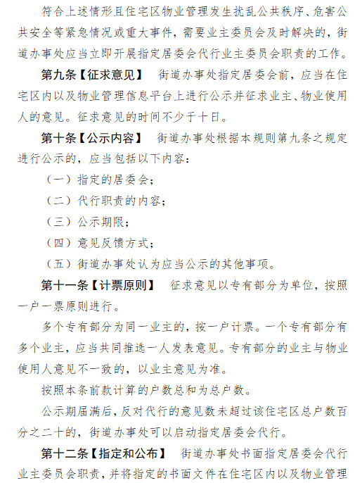 符合上述情形且住宅區(qū)物業(yè)管理發(fā)生擾亂公共秩序、危害公共安全等緊急情況或重大事件,需要業(yè)主委員會(huì)及時(shí)解決的,街道辦事處應(yīng)當(dāng)立即開(kāi)展指定居委會(huì)代行業(yè)主委員會(huì)職責(zé)的工作。