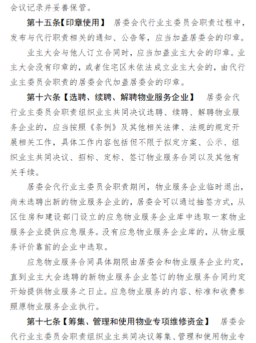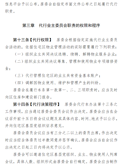 在《條例》第一百二十四條的基礎(chǔ)上,《管理辦法》第三章第十三條對(duì)社區(qū)居民委員會(huì)代行業(yè)主委員會(huì)職責(zé)的權(quán)限予以具體規(guī)范,明確社區(qū)居民委員會(huì)履行業(yè)主委員會(huì)“組織業(yè)主共同決議”“代管業(yè)主共有資金基本賬戶”的主要職能,并在第十六條至第十九條中對(duì)社區(qū)居民委員會(huì)代行業(yè)主委員會(huì)職責(zé)開(kāi)展選聘、續(xù)聘和解聘物業(yè)服務(wù)企業(yè),籌集、管理和使用物業(yè)專項(xiàng)維修資金以及使用和管理業(yè)主共有資金等活動(dòng)的具體職責(zé)予以細(xì)化。