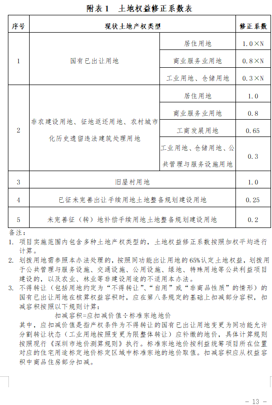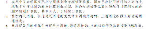 土地權(quán)益修正系數(shù)體現(xiàn)土地產(chǎn)權(quán)條件的差別。土地權(quán)益修正系數(shù)根據(jù)原農(nóng)村集體經(jīng)濟(jì)組織繼受單位合法用地、國有出讓用地、已征未完善出讓手續(xù)、未完善征(轉(zhuǎn))地補(bǔ)償手續(xù)用地等設(shè)計(jì)不同的土地產(chǎn)權(quán)系數(shù)。土地權(quán)益修正系數(shù)的取值主要考慮了和現(xiàn)行政策的銜接,如對(duì)于非農(nóng)建設(shè)用地中工商用地按照65%、工業(yè)用地按照30%系數(shù)核算,主要考慮了與《深圳市原農(nóng)村集體經(jīng)濟(jì)組織非農(nóng)建設(shè)用地和征地返還用地土地使用權(quán)交易若干規(guī)定》(深府〔2011〕198號(hào))、《關(guān)于征地安置補(bǔ)償和土地置換的若干規(guī)定》(深府〔2015〕81號(hào))等文件的銜接,未完善征(轉(zhuǎn))地補(bǔ)償手續(xù)用地按照20%系數(shù)核算,主要考慮了和“6號(hào)文”的銜接。此外,對(duì)于國有已出讓用地,考慮到土地剩余年期的差異,按照現(xiàn)行《深圳市地價(jià)測(cè)算規(guī)則》進(jìn)行年期系數(shù)修正。項(xiàng)目范圍內(nèi)包含多種用地類型時(shí),土地權(quán)益修正系數(shù)在各類用地土地權(quán)益修正系數(shù)的基礎(chǔ)上結(jié)合用地占比進(jìn)行加權(quán)平均計(jì)算。