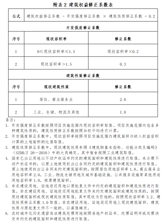 土地權(quán)益修正系數(shù)、建筑權(quán)益修正系數(shù)、留用土地功能修正系數(shù)取值詳見附表。