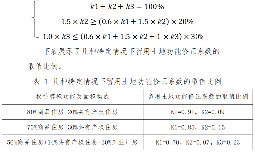 假定一宗留用土地權(quán)益容積擬安排商品住房、共有產(chǎn)權(quán)住房、普通工業(yè)等功能,各功能留用土地功能修正系數(shù)的取值比例分別為k1、k2、k3。本辦法約定留用土地優(yōu)先安排以居住為主導(dǎo)的功能,其中共有產(chǎn)權(quán)住房不低于權(quán)益容積中居住部分的20%;確需安排工業(yè)功能的,工業(yè)部分不超過權(quán)益容積的30%。因此各功能留用土地功能修正系數(shù)的取值比例需滿足以下條件: