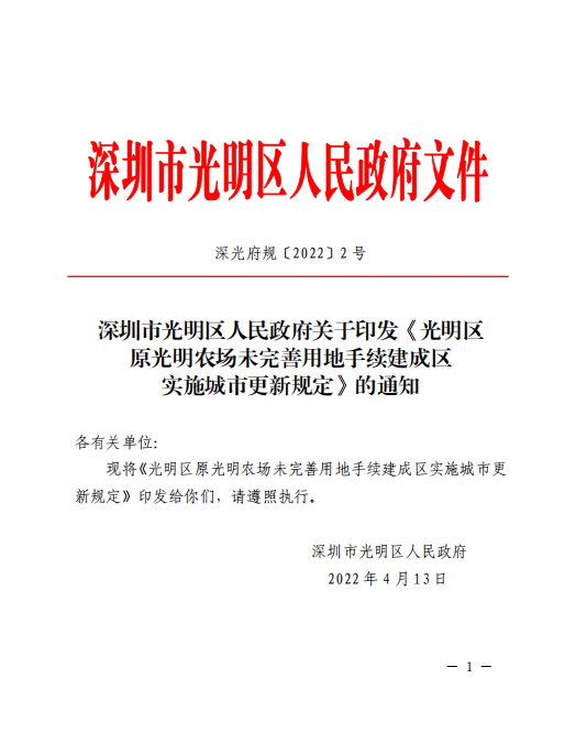 【摘要】4月13日,深圳市光明區(qū)人民政府發(fā)布了《光明區(qū)原光明農(nóng)場未完善用地手續(xù)建成區(qū)實施城市更新規(guī)定》的通知。
