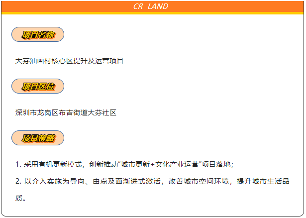 2022年5月23日,華潤置地中標(biāo)布吉街道大芬油畫村核心區(qū)提升及運營項目。此次中標(biāo)運營服務(wù)商,華潤置地將以高品質(zhì)、高標(biāo)準(zhǔn)改造及運營大芬油畫村,項目主要由有機更新、文化運營、產(chǎn)業(yè)提升構(gòu)成,以針灸式、微改造、重保育的方式實施,尊重大芬油畫村產(chǎn)業(yè)基因,提升大芬在新時代作為城市藝術(shù)聚落功能的品質(zhì),形成獨具特色的大芬油畫村的更新及運營體系,力爭重振“世界大芬”品牌形象。