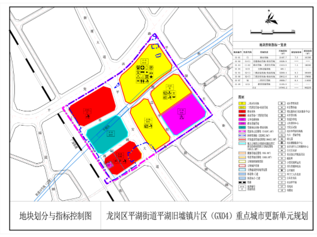 根據(jù)《龍崗區(qū)平湖街道平湖舊墟鎮(zhèn)片區(qū)(GX04)重點(diǎn)城市更新單元規(guī)劃》(深龍府函〔2021〕7 號,見附件一),本項(xiàng)目主要經(jīng)濟(jì)技術(shù)指標(biāo)具體如下:更新單元用地面積216387.5平方米,拆除范圍用地面積202082.9平方米,開發(fā)建設(shè)用地面積106622.3平方米,其中 3000平方米國有未出讓的零星用地按照城市更新辦法及實(shí)施細(xì)則一并出讓給項(xiàng)目實(shí)施主體。規(guī)劃計(jì)容積率建筑面積862230平方米,其中住宅 463000 平方米(含安居型商品房 68696 平方米,公共租賃住房 17174 平方米),商業(yè)、辦公及旅館業(yè)建筑336930平方米,地下商業(yè)29470平方米,公共配套設(shè)施(含地下)32830平方米。另配建社區(qū)體育活動(dòng)場地占地面積4500平方米。