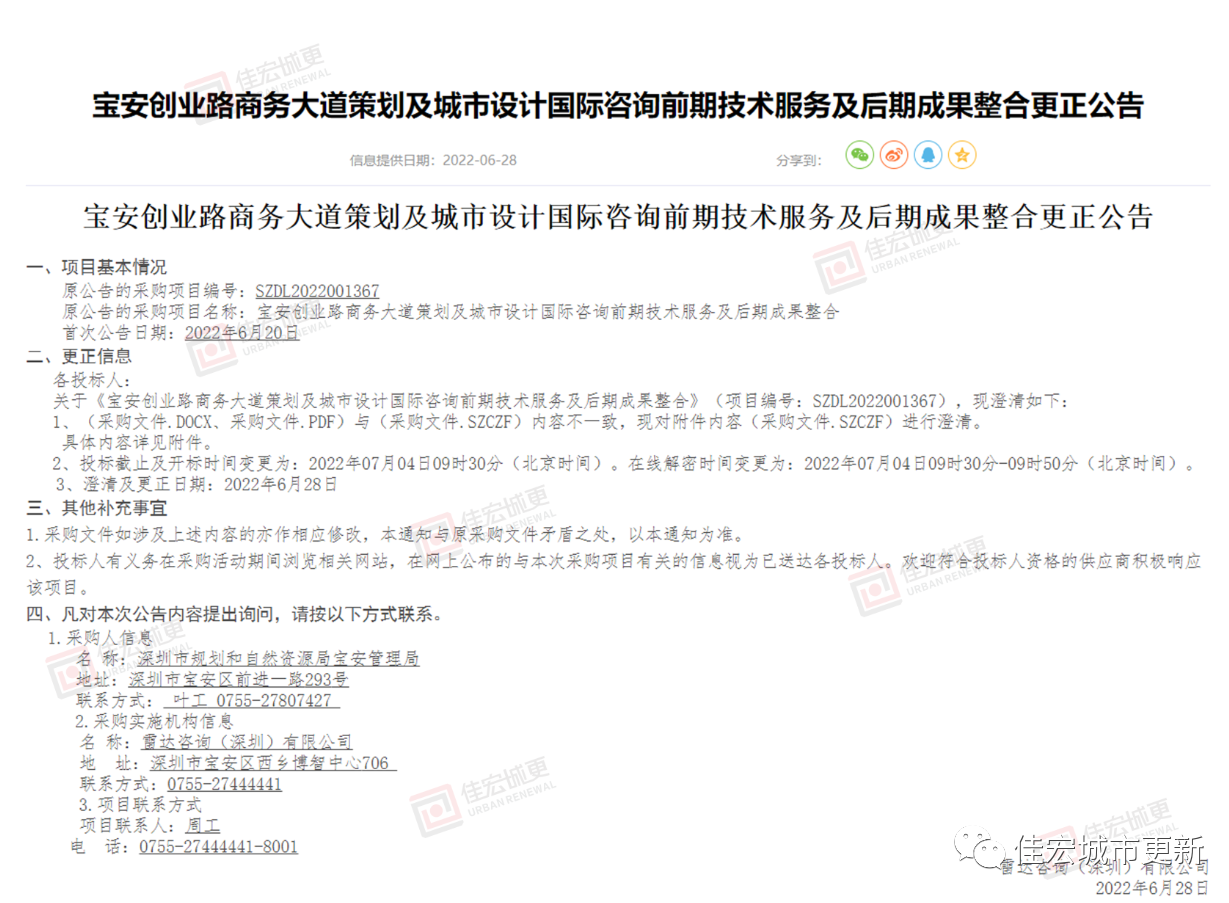 【摘要】6月28日,"寶安創(chuàng)業(yè)路商務(wù)大道策劃及城市設(shè)計國際咨詢前期技術(shù)服務(wù)及后期成果整合更正公告"公示,本項目控制金額為人民幣 380 萬元,投標截止及開標時間變更為:2022年07月04日09時30分(北京時間)。