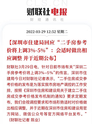 【摘要】3月29日,據(jù)財(cái)聯(lián)社消息,針對(duì)日前市場(chǎng)有關(guān)“深圳二手房參考價(jià)將上調(diào)3%-5%”的傳言,深圳市住建局回應(yīng)稱(chēng):